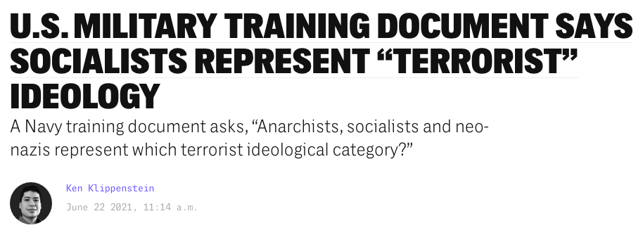 Klippenstein contends that the document shows that the military considers socialism to be a “terrorist” ideology and that it considers socialists to be targets of anti-terror activity. But what the material is actually conveying (which can be confirmed in Chapter 2 of the document) is that those who commit terror in the name of any political ideology — be it anarchism, neo-nazism, or socialism — simply fall under the category of “political terrorists.” In other words, there is no assertion that socialism or socialists (or anarchy or anarchists) are themselves targets of anti-terror operations, but rather that those who commit acts of terror in the name of those ideologies are considered terrorists (and specifically, political terrorists).